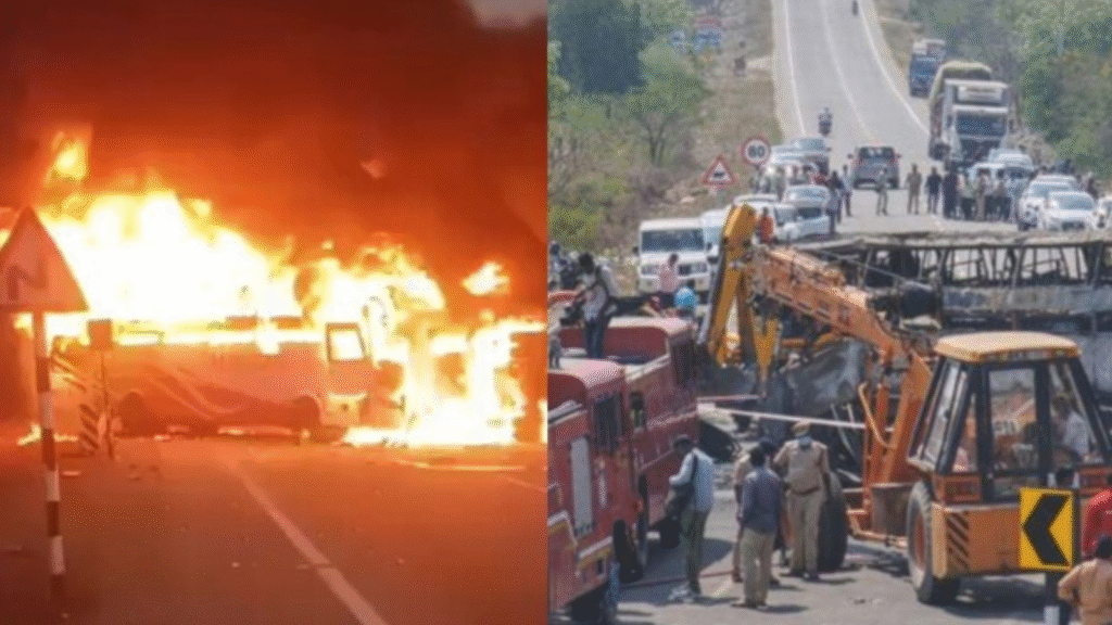 மோதலின் தாக்கத்தில் பேருந்தின் எரிபொருள் தொட்டியில் கசிவு ஏற்பட்டு, உடனடியாக தீப்பிடித்தது. தீ வேகமாக பரவி, பேருந்து முழுவதும் எரிந்தது.